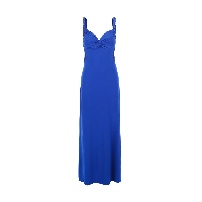 Elegant lang marineblå glamorøse maxikjole fra Lucas & Emma med åpninger på begge side. Kjolen er pyntet med blå glitrende paljetter. Laget av god,glatt elastisk materiale.